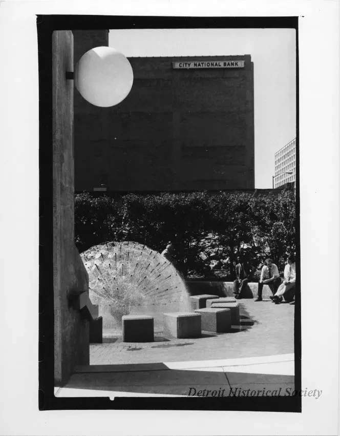 Black and white photographic print mounted on board depicting a hemispherical fountain in New Center Park with four men around it. A sign on a building in the background reads "City National Bank". In the foreground is a ball shaped light.