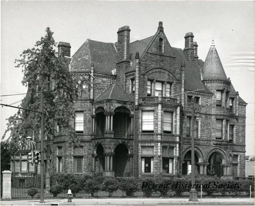 Black and white oversized photographic print mounted on board depicting the David Whitney House on the west side of Woodward Avenue at W Canfield Street. A stoplight and a fire hydrant are visible in the foreground.
