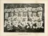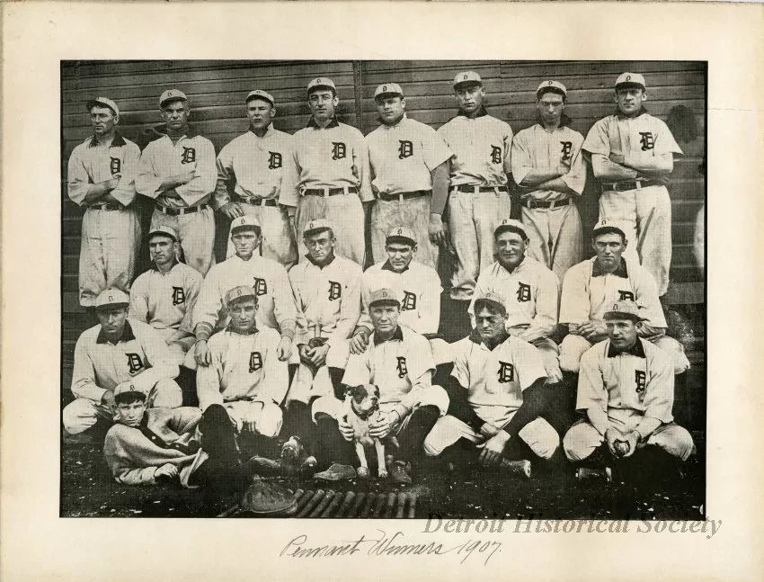 Black and white photographic print, on board, showing the 1907 Detroit Tigers. The team is arranged in three rows. The men in the back row are standing, the men in the middle row are sitting on benches, and the men in the front row are sitting on the ground. There is a dog in the front center. Text underneath the image reads "Pennant Winners 1907."