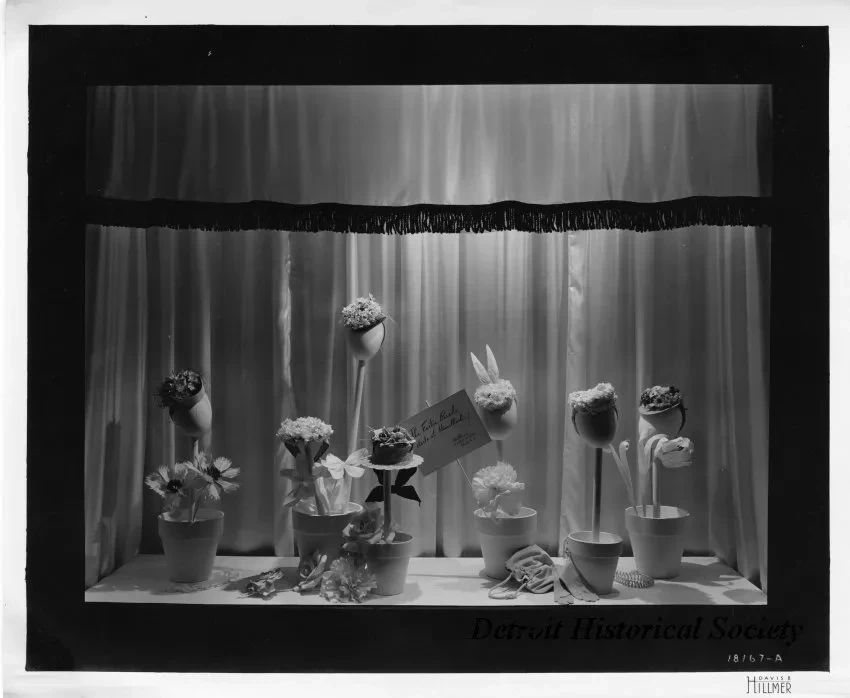 Print. Black and white photograph of the window display at Himelhoch's Department Store. Displayed in the window is a series of ladies hats, which are giving the illusion that they are potted flowers. Signage coming out of one of the pots in the center of the window reads, "The Easter Parade starts at Himelhoch's!" The photographic sequence number and photographer's name are printed in the lower right corner, "18167-A, Davis B. Hillmer." Date of the image has been written on the verso, "Feb. 27, 1940."