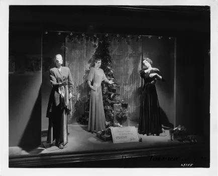 Print. Black and white photograph of the window display at Himelhoch's Department Store. Three female mannequins are expertly dressed in the latest style of hostess robes on Christmas morning. The advertisement in the foreground of the display reads, "Christmas Dreams of fabulous beauty, Luxurious Hostess Robes for Someone Special, fifth floor." Printed in the lower right corner of the recto is the photograph sequence number, "23755." Also, the date is hand-written on the verso, "Nov. 25, 1948."