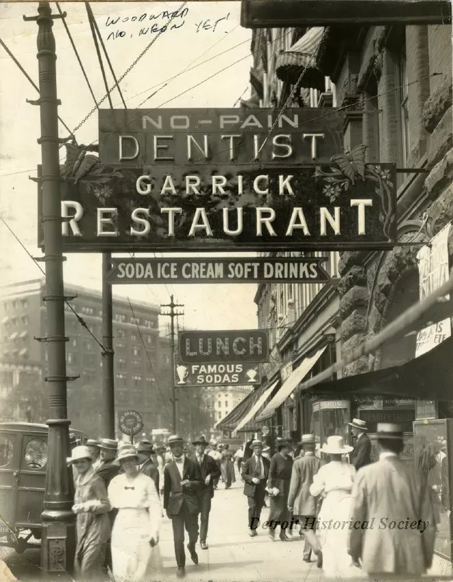 Sepia-toned glossy photo shows a busy downtown sidewalk with many pedestrians, adjacent storefronts, and a parked automobile. Overhead signs advertise the "Garrick Restaurant" and a "No-Pain Dentist" as well as sodas, ice cream, and lunch. Handwriting in the upper right corner reads "Woodward, no neon yet." An ink stamp on the verso reads "Manning Bros., Commercial Photographers, 504-505 Lincoln Building, Corner State and Park Sts., Detroit, Mich."