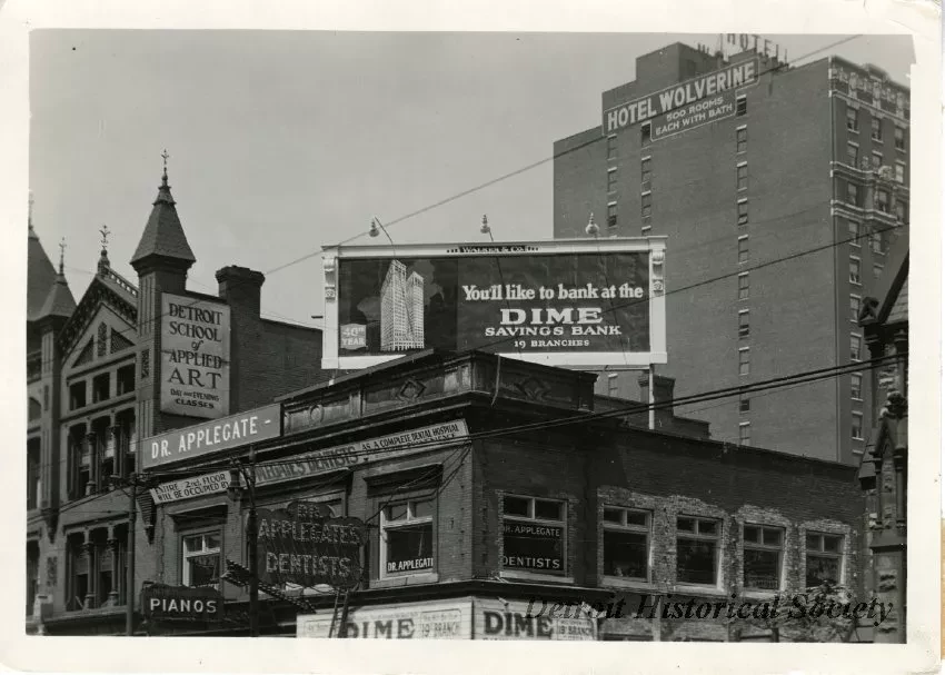 Black and white glossy photo showing buildings along the east side of Woodward Avenue just north of the Central United Methodist Church. Businesses that are visible include Detroit School of Applied Art, Detroit Music Co., Hotel Wolverine, Dr. Applegate Dentists, and Dime Savings Bank (19th branch). A handwritten date on the verso shows "6/19/24."
