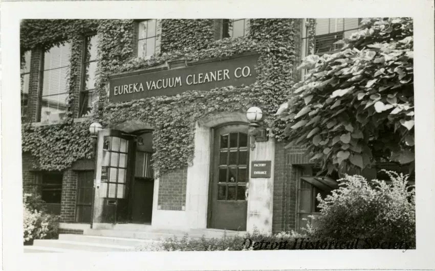 Black and white photograph of the facade of the Eureka Vacuum Cleaner Company factory at the corner of Hamilton Avenue and Dewey Street. A small plaque to the right of the closed door-way notes that this is the factory entrance.