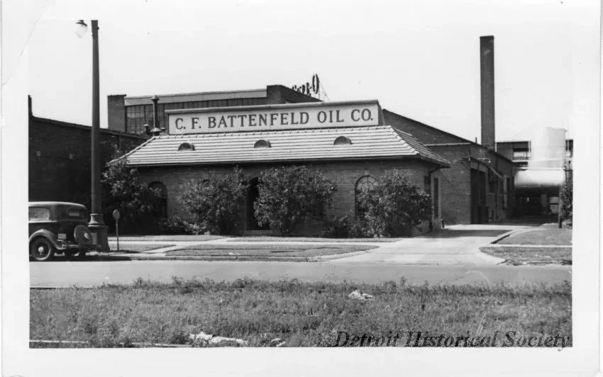 Black and white image of the C. F. Battenfeld Oil Company. An automobile is parked near the front of the building which is located at 1340 Oakman Boulevard.