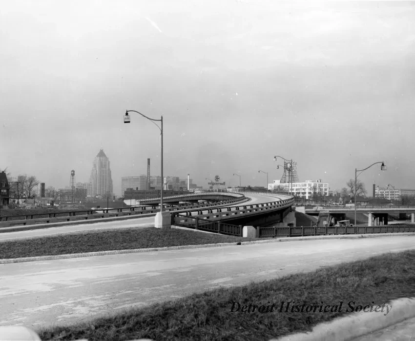 Print. (2 copies.) Black and white street view photograph of the north-bound on ramp of the John C. Lodge Freeway (M-10), as well as the east-bound lanes of the Edsel Ford Freeway (I-94) in the foreground. Construction is taking place on the Ford Freeway below. Visible in the background, from left to right, are the Fisher Building, Cadillac Place (The General Motors Building), Burroughs Corporation, General Electric, and Cadillac Motor Car Division. Noted on the verso, "1950s, Ford Freeway Construction at Lodge." Also, stamped on the verso,"General Motors Photographic Division, no. x 15744-3, please refer to this number when ordering prints."
