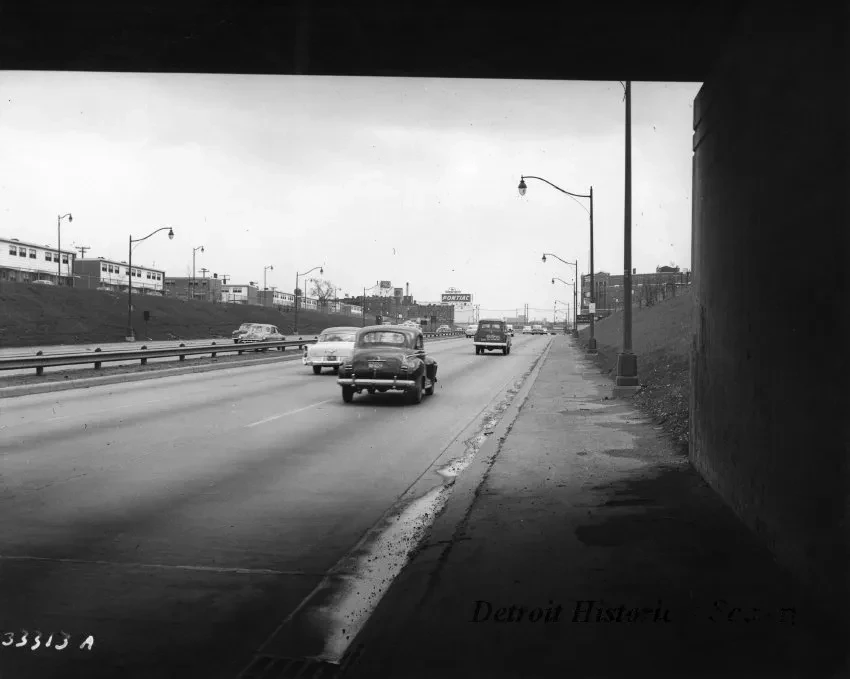 Black and white street view photograph of the south-bound lanes of the John C. Lodge Freeway. Photograph was taken from under the Myrtle Street bridge and looking toward Temple and Grand River; north-bound lanes are in the background. Residential and commercial buildings are adjacent to the freeway; advertisments are visible for Coca-cola and Pontiac. The photograph number is visible in the lower left corner, "33313 A." Written on the verso, "Lodge Fwy at Myrtle, looking south."