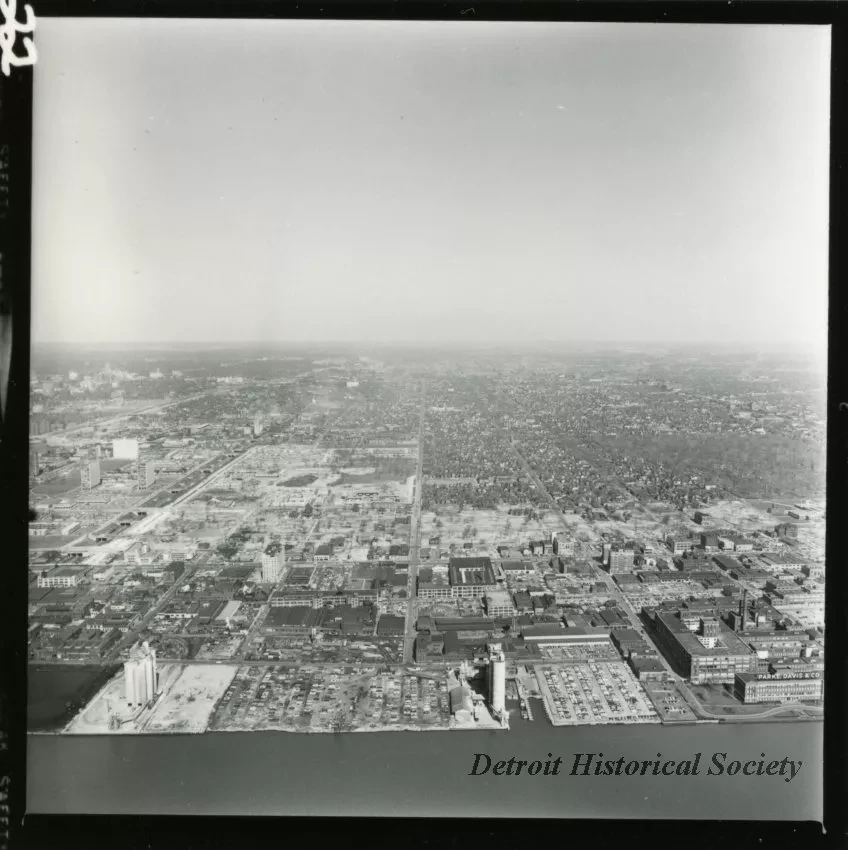 Black and white aerial photograph cut from a proof sheet taken of the riverfront, and Elmwood Park beyond, centered around Chene Street, from above the Detroit River. The Holnam and Medusa Cement silos, the Parke, Davis and Company complex, Lafayette Park, Elmwood Cemetery, and Mt. Elliott Cemetery are all in view. "M-2054," was handwritten on the verso of the proof sheet.