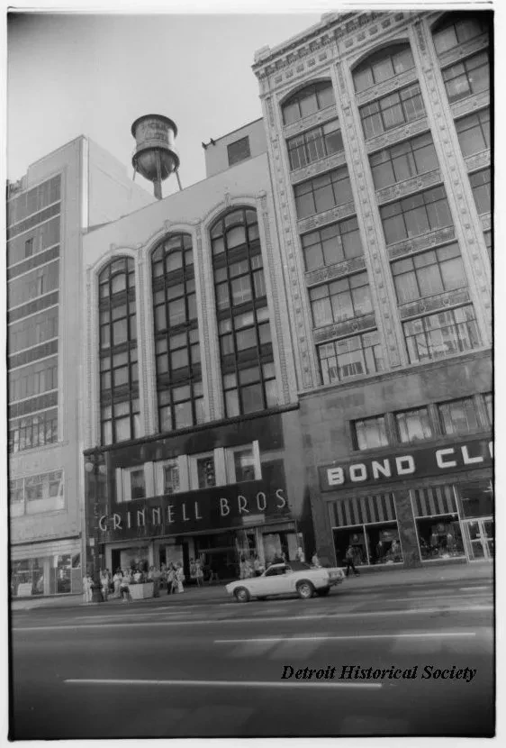 Black and white photo of storefronts along the west side of Woodward Avenue along Merchants Row between Clifford Street and Park Avenue including Grinnell Bros. and Bond Clothes.