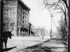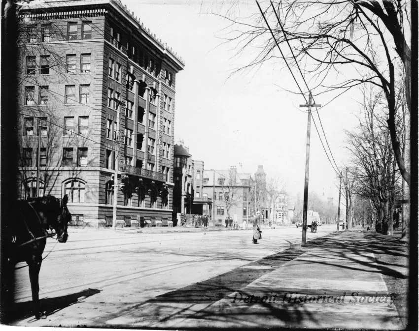 Black and white street view photograph from a glass plate negative of the west side of Woodward Avenue, between Charlotte and Peterboro. A horse is visible in the left foreground next to the curb and sidewalk on the east side of Woodward. A pedestrian crosses the street, away from the Addison Apartments and single family residential buildings on the west side of the thoroughfare. Further down Woodward, pedestrians, an automobile, horse carriage and street car are all visible. Written on the verso, "West side of Woodward, looking north, between Charlotte and Peterboro."