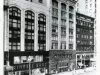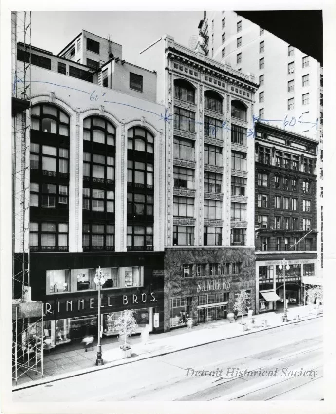 Black and white photograph of the Grinnell Brother's Building, Sanders Building, and the Himelhoch Brothers and Company Building on the west side of Woodward Avenue between Clifford Street and Park Avenue, along Merchants Row. Wares are visible in the storefronts of Grinnell Brothers, Sanders, and Himelhoch Brothers and Company at street level. Sign in the Grinnell Brothers windows celebrate the company's 80th year. The blurs of passing pedestrians dot the sidewalk. Scaffolding on the Woodward face of the Michigan National Bank building is visible along the left edge of frame. The David Whitney Building stands on the right edge of the frame. Handwritten measurements along the faces of the three central buildings have been made near their tops in blue pen.