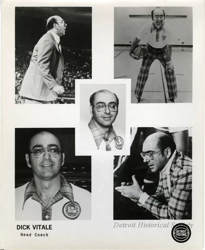 Click to enlarge 2010.016.005 Print, Photographic Black and white photo collage of Detroit Pistons head coach Dick Vitale. Date 1979 Collection Sports Print Size 8" x 10" Search Terms Detroit Pistons, Basketball, Plaid People Vitale, Dick Request Image
