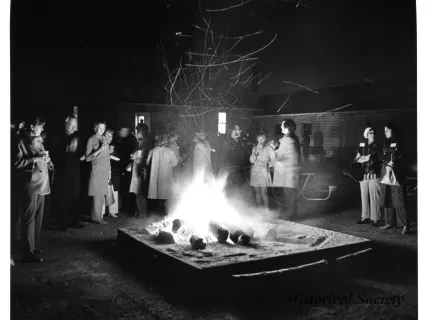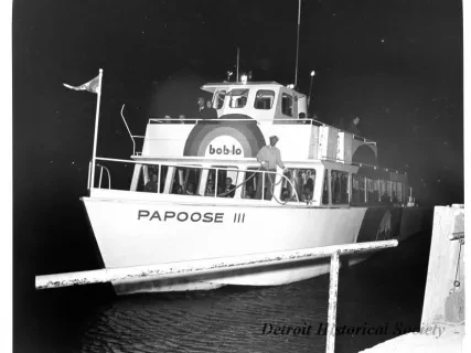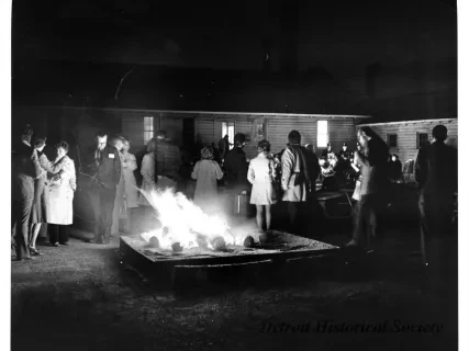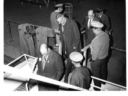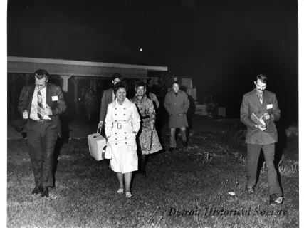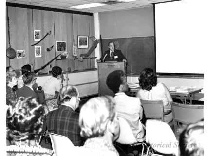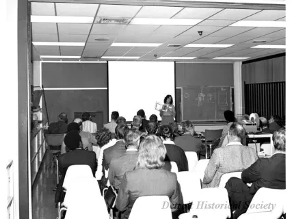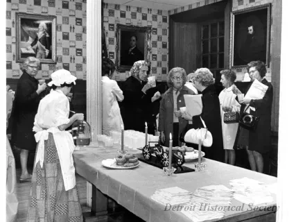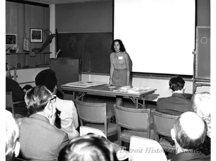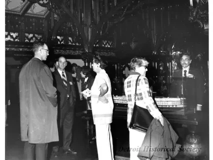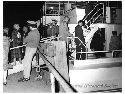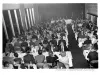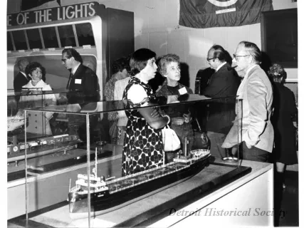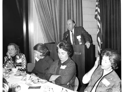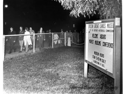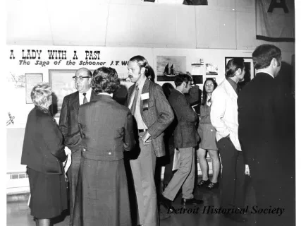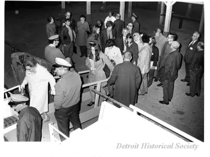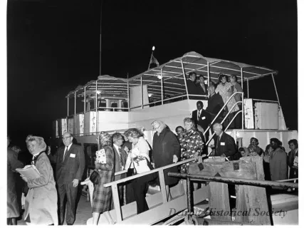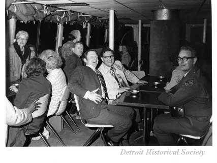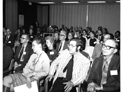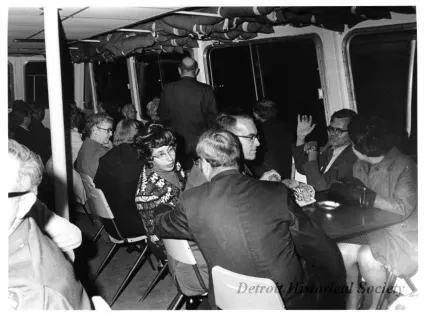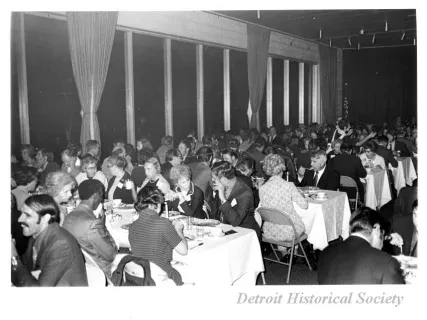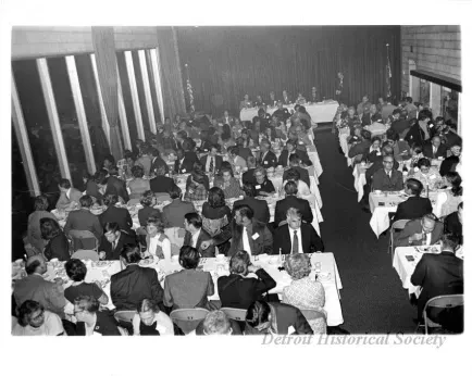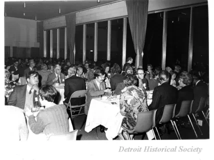 Black and white photographic print of the Midwest Museum Conference attendees partake in Friday evening dinner in DeRoy Hall, at the Dossin Great Lakes Museum. Many of the attendees are looking out the large windows toward the Detroit River, on the left side of the hall. Typed on the verso, "Midwest Museum Conference, Sept. 1971." Also, the name of the photographer is stamped on the verso, "Photo by Harry J. Wolf, 1686 Evans Ave., Detroit 9, Mich."