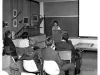 Black and white photographic print of a Midwest Museum Conference lecture held in Education Hall inside the Detroit Historical Museum; a woman stands behind the lectern and attendees are seated in chairs in the foreground. Artifacts from the Detroit Historical Society's collections are exhibited on the wall and shelving units on the left side of the room. Typed on the verso, "Midwest Museum Conference, Detroit Historical Museum, Education Hall - Sept. 1971."
