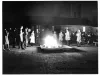 Black and white photographic print of Midwest Museum Conference attendees standing around a bonfire, built atop a square platform adjacent to one-story buildings with clapboard siding, and large eaves at Historic Fort Wayne. The City of Detroit Police Band is visible in the right corner, neighboring the building. Handwritten on the verso, "Fort Wayne, Midwest Museums Conference, Sept. 1971." Also, the name of the photographer is stamped on the verso, "Photo by Harry J. Wolf, 1686 Evans Ave., Detroit 9, Mich."