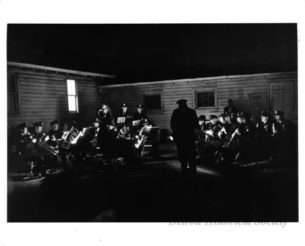 Black and white photographic print of the Detroit Police Department Band playing in front of one of the buildings, adjacent to the barracks at Historic Fort Wayne; the band performed for attendees of the Midwest Museum Conference. . Handwritten on the verso, "Detroit Police Department Band, Midwest Museum Conference - Ft. Wayne - Sept. 1971." Also, the name of the photographer is stamped on the verso, "Photo by Harry J. Wolf, 1686 Evans Ave., Detroit 9, Mich."