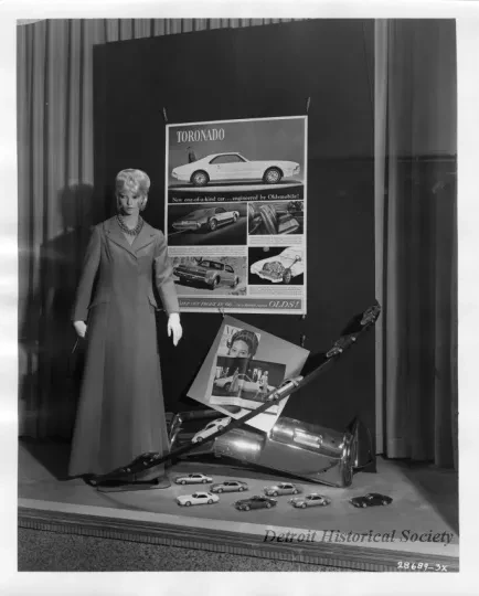 Print. Black and white photographic print of a window display at Saks Fifth Avenue department store. A female mannequin dressed in a house coat stands left of display model automobiles, as well as advertisements for the 1966 Oldsmobile Toronado, signage reads, "Toronado, New one-of-a-kind car... engineered by Oldsmobile... Step out front in '66... in a Rocket Action OLDS!!! Printed in the lower right corner of the recto is the photograph sequence number, 28689-3x." Also, stamped on the rear is the name, and location of the photographer, "Davis B. Hillmer Commercial Photography 8825 Second Ave., Detroit, 2- Michigan. TR5-7620 TR2-8000."