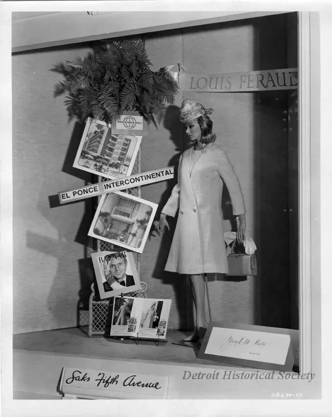 Print. Black and white photographic print of a window display at Saks Fifth Avenue department store. A female mannequin is dressed in a suit, jacket, pearls, hat, handbag and gloves. Images adjacent to the mannequin feature hotels, Steve McQueen on the cover of Harper's Bazaar magazine, and a fashion catalog; between the images is an advertisement for Intercontinental Hotels and El Ponce International. Above the mannequin and affixed to the rear wall is the name of French fashion designer, "Louis Feraud." Signage at the feet of the mannequin reads, "Young Elite Shops Second Floor." The photographic sequence number is printed in the lower right corner of the recto, "28639-2X." Stamped on the verso is the name and location of photographer, "Davis B. Hillmer Commercial Photography, 8825 Second Ave., Detroit 2. Michigan. TR5-7620, TR2-8000."