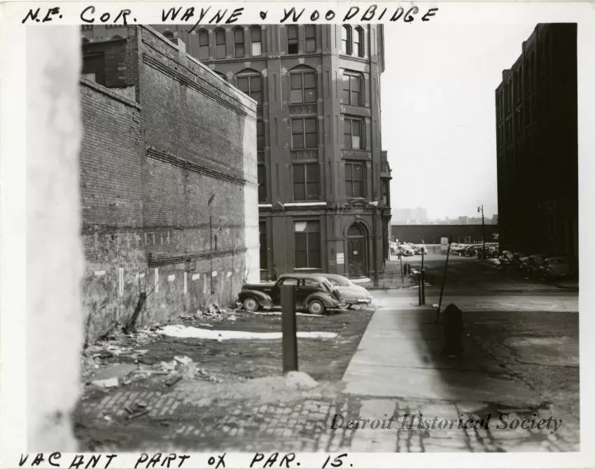 Black and white photograph taken from the sidewalk on the east side of Wayne Street, north of Woodbridge Street, facing south. The side of the building housing Sam and William Hoffman, Manufacturing Agents, and the adjacent parking lot is on the immediate left. Ahead on the southeast corner of Wayne and Woodbridge, is the Master Paper and Box Company building. Further along Wayne is a parking lot at the riverfront, where what appears to be part of a freighter, or the hull of a passenger boat in the process of being scrapped, with the Detroit and Cleveland Navigation Company logo painted on the side is docked. "N.E. Cor. Wayne & Woodbridge, vacant part of Par 15," is handwritten in ink around the border on the recto. "C. 1950, WWII," is handwritten in pencil on the verso.