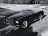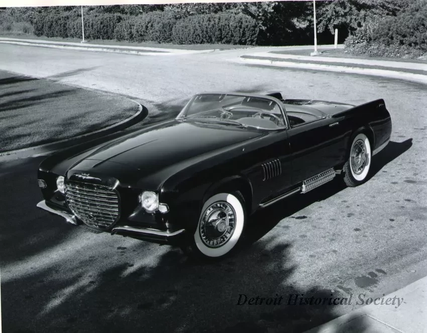 Black and white print of a 1955 Chrysler Falcon concept car convertible. The front and driver's side of the car can be seen; the grill is rounded and there are decorative exhaust pipes on the driver's side, along with whitewall tires. The car is parked on an empty street and there are trees in the background.