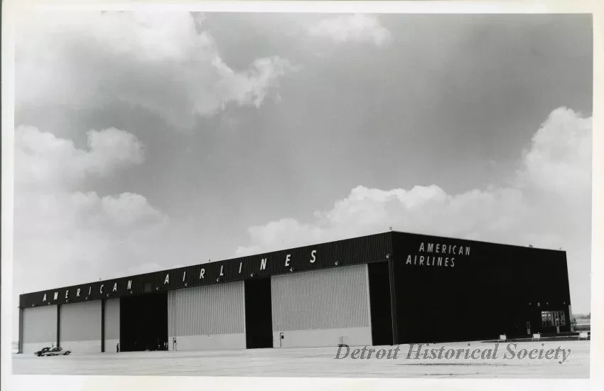 Black and white photographic print depicting an American Airlines hangar at Detroit Metro Airport. To the left are two parked cars.