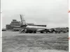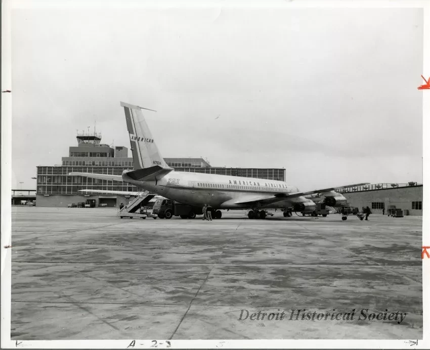 Black and white photographic print depicting an American Airlines Boeing 707 jetliner on the tarmac at Detroit Metro Airport, with the L.C. Smith Terminal in the background. Ground support equipment surrounds the aircraft.