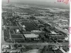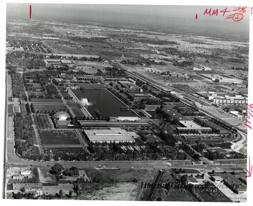 Black and white photographic print depicting an aerial view of the GM Tech Center in Warren, facing north. In the foreground is 12 Mile Road.