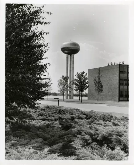 Typed on verso: 140-foot-high water tower at the GM Technical Center