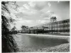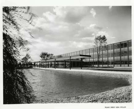 Black and white photographic print depicting the Research & Development Center Building at the GM Tech Center, with the lake in the foreground.