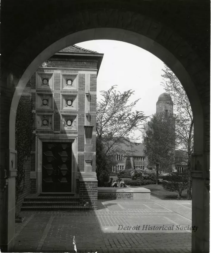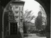 Black and white photographic print depicting the entrance to the dining hall of Cranbrook School, with the observatory tower in the background. An archway frames the west-facing view. Handwritten on verso: "Pg 8 in Ladies entertainment booklet"
