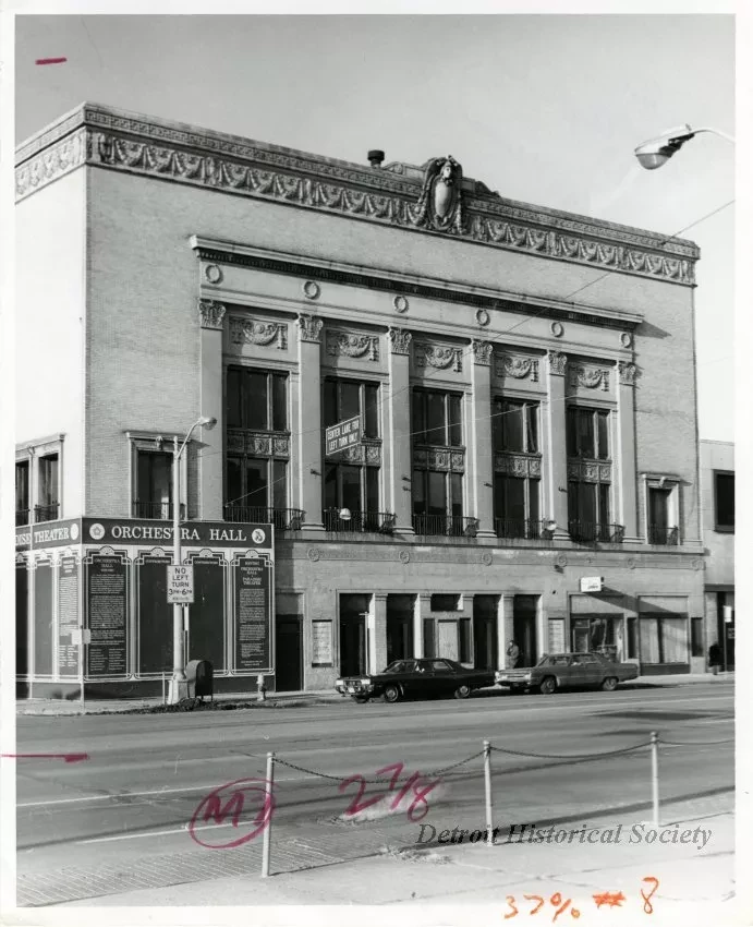 Several notes, presumably concerning the publication of this image, have been handwritten on the recto in red and orange grease pencil, "M7 2 7/8," and "37% #8," as well as a pair of horizontal lines near the left edge. "Used 1977, April Motor News," and "Orchestra Hall, Detroit, Mich." are handwritten on the verso.