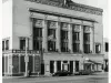 Black and white photo of the exterior of Orchestra Hall, as taken from the sidewalk on the eastside of Woodward Avenue, next to the intersection with Parsons Street, facing northwest. Several panels of information about the building, the campaign to save the structure, and blank spaces for contributors to the project, have been posted around the Parson-Woodward corner of the building. A sign for a Detroit Police Department mini-station is posted above a doorway on the north side of the building's Woodward face. Two cars are parked along Woodward in front of the building's entrance, and a man walks southward behind them. Another figure is near the right edge of frame, in front of the theatre.