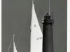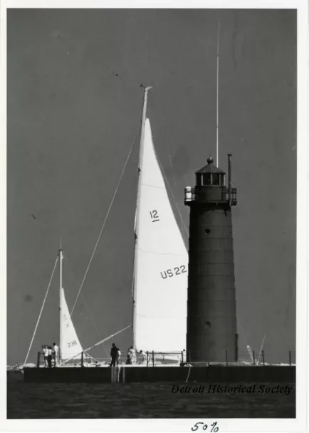 Black and white photo of the Muskegon Pier Lighthouse taken from the south. Several people stand on the pier beneath the lighthouse. The masts and sails of two sailboats are visible beyond the lighthouse. A handwritten note on a label affixed to the verso reads, "LK Mich shoreline & sail-bys at Muskegon's landmark lighthouse. Brodbeck photo (used May '87 ML [Michigan Living]."
