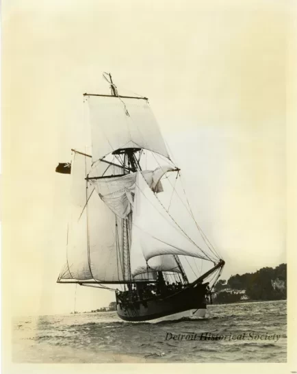 Sepia-toned photo of the reconstruction of the sailing ship WELCOME, under sail with its starboard bow to the camera. A shoreline lined with homes and trees is visible in the background. A typewritten caption on the verso reads, "The armed sloop WELCOME will be sailing the Straits region on Saturday, July 26, from mid-morning to late afternoon. The reconstruction of this vessel, originally built in 1775 by trader John Askin, was sponsored by the Mackinac Island State Park Commission. When not sailing, the WELCOME can be toured at its dock in Mackinaw City through Labor Day."