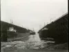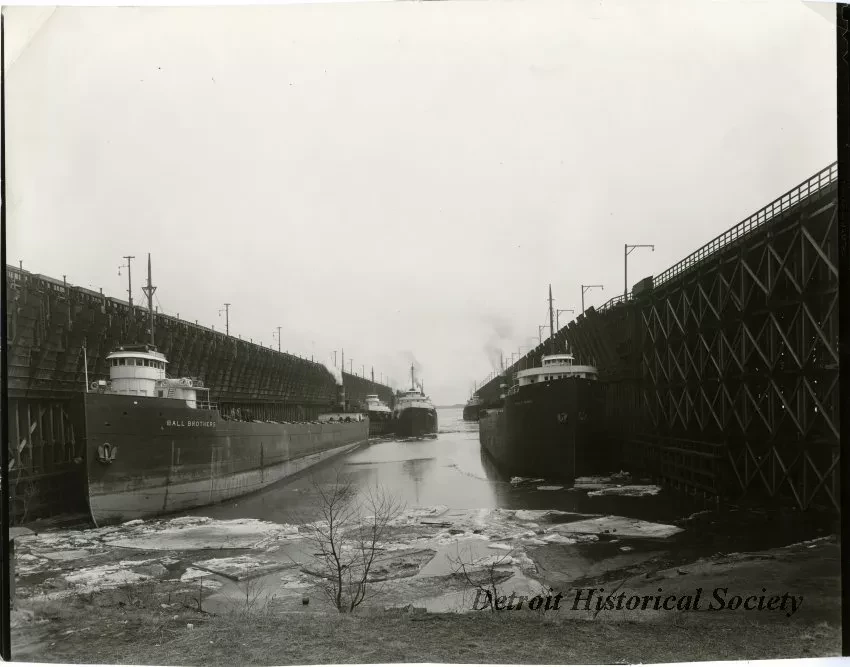 Sepia-toned photo of the Globe Steamship Company freighter BALL BROTHERS, the Triton Steamship Company freighter RUFUS P. RANNEY, the Reiss Steamship Company freighter CLEMENS A. REISS, the Johnstown Steamship Company freighter LEHIGH, and a fifth unidentified freighter docked at the Escanaba ore docks in the winter, each with the bow toward the camera. Sheets of ice float atop the water near the foot of the canal in the foreground. Two small groups of people are visible on the deck of the BALL BROTHERS.