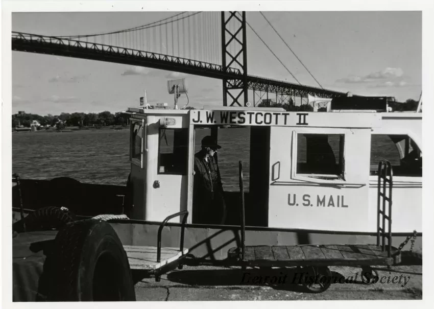 Black and white photo of the captain of the mail boat J.W. WESTCOTT II in the boat's cabin, as taken from the boat's dock. Several carts and tires are on the shore in the foreground. The Ambassador Bridge stands in the background. "N. Lahr, Det. River (converted to B+W)" is handwritten on the verso.