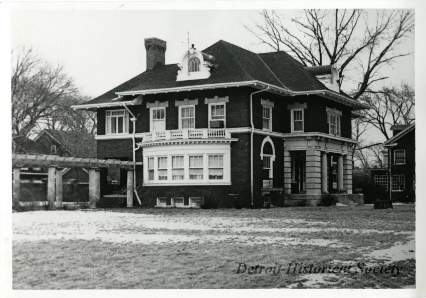 Black and white photograph of the Henry and Clara Ford home on the north corner of Edison Street and Second Avenue, as viewed from the south. Snow covers parts of the building's lawn. Previously taped to the verso of the photo was a typewritten caption: