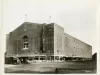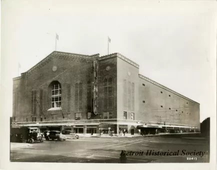 Black and white photographic print depicting Olympia Stadium from the corner of Grand River Avenue and McGraw Street. Cars, trucks and pedestrians are in the street.
