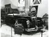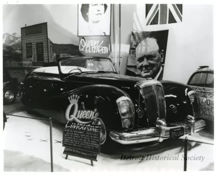 Black and white photographic print depicting a 1949 Daimler convertible on display between two other cars. A sign on the floor reads "Queen's Limousine. In 1949 Her Royal Highness