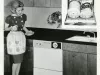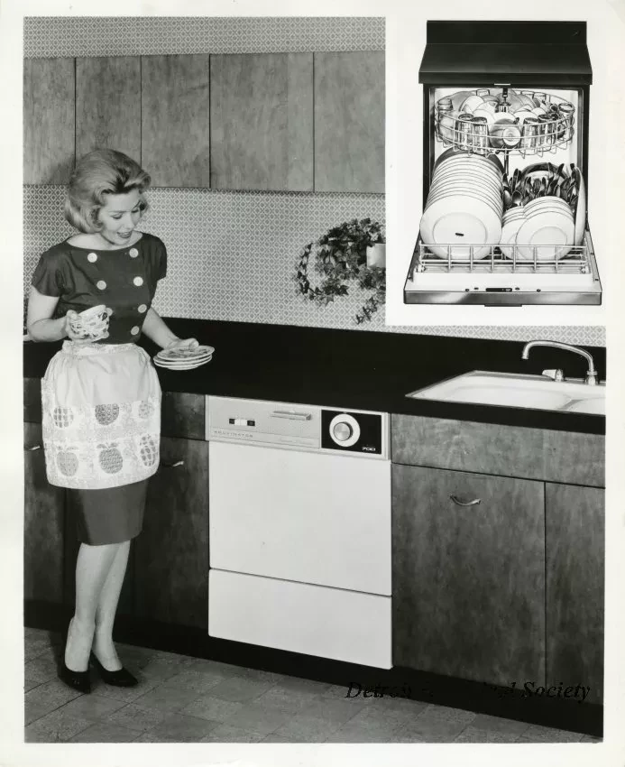 Black and white promotional photo of a Kelvinator Series 700 Automatic Dishwasher, showing a woman wearing an apple-print apron and holding several dishes, standing beside the dishwasher, installed beneath a kitchen counter. An insert containing an illustration of the interior of the dishwasher, filled with dishes is at the upper right.