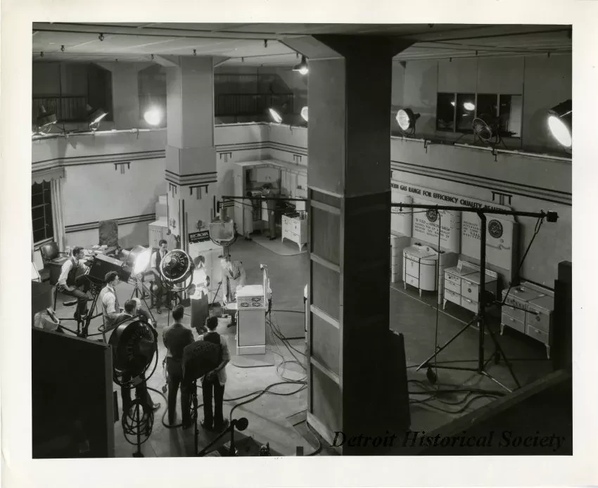 Black and white behind-the-scenes photo of a Metropolitan Motion Picture Company shoot for a Kelvinator commercial taken overlooking the filming of a scene where a man demonstrates a kitchen stove to a woman. The crew is clustered in the lower left. An office, a kitchen, and a row of stoves positioned beneath promotional text are set up in other parts of the studio.