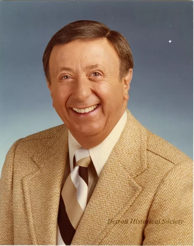 Color head-and-shoulders portrait photograph of radio and television personality Sonny Eliot. He wears a beige tweed suit and a brown, beige, and white tie.