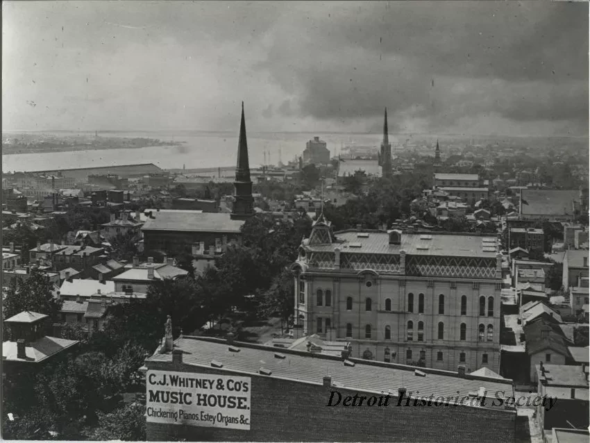 Black and white photographic print depicting an view along West Fort Street taken from an elevated position downtown. C.J. Whitney and Company's Music House is at the bottom of the frame. Three church spires including that of the Fort Street Presbyterian Church in the center, are visible. The Detroit River and part of Windsor are in the background. "Joseph Klima Jr, Photographer, 5200 Woodward Avenue, Detroit 2, Michigan, TEmple 1-0360" stamped on verso. "1870s" handwritten on verso.