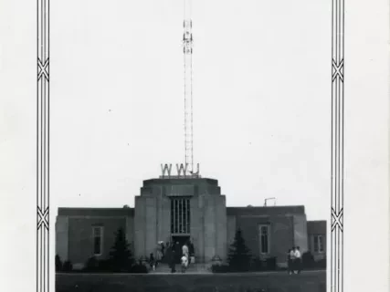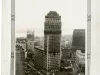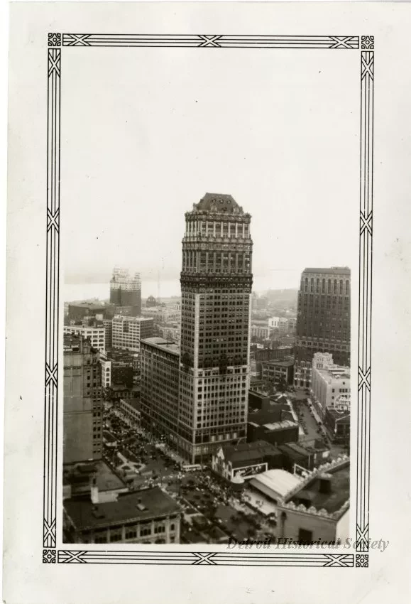 Small sepia-toned photographic print with the handwritten caption on the verso, "Picture taken from 34th floor of Eaton Tower, of Book Tower" along with stamps that read, "Jul 1931" and "126." The Industrial Bank Building, the Michigan Bell Building, and the Detroit River as also in view. The image is surrounded with a rectangular border with x-shaped motifs.