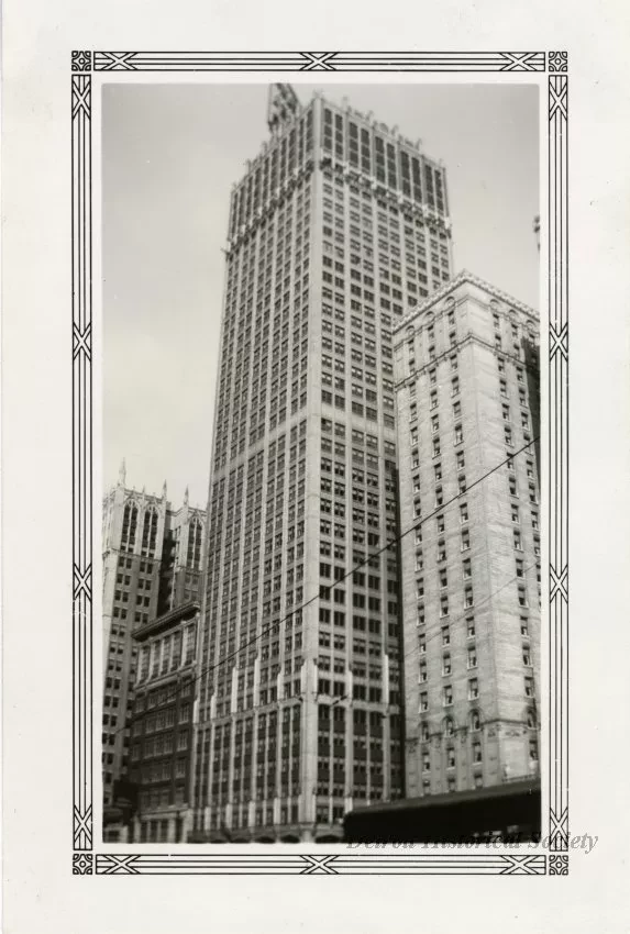 Small sepia-toned photographic print with a handwritten caption on the verso which reads, "Cadillac Square, Barlum Hotel, Barlum Tower, and Real Estate Exchange." A portion of the New Cadillac Square Apartments is also captured. The buildings were shot from the ground in Cadillac Square, east of Bates Street, facing northwest. The image is surrounded with a rectangular border with x-shaped motifs. "137" is stamped on the verso.