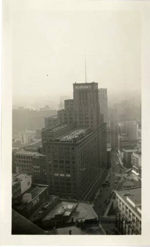 Small sepia-toned photographic print, with the handwritten caption on the verso "Picture taken from the 39th floor of the Barlum Tower, of Hudson's" with the stamp "Jul 20 1934." In addition to Hudson's, the roof of Kern's, Crowley's, the Downtown Library, the Hotel Dixieland, the Metropolitan Building, and the David Broderick Tower are all visible.