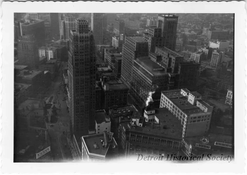 Black and white photographic print depicting a view north from atop the Penobscot Building. The David Stott Building, the Majestic Building, Kern's, Hudson's, Woodward Avenue, the David Broderick Tower, the David Whitney Building, the Industrial-Stevens Apartments, and Detroit Statler Hotel are visible. Billboards for Camel Cigarettes and Red Crown Gasoline. The photo has a deckled edge.