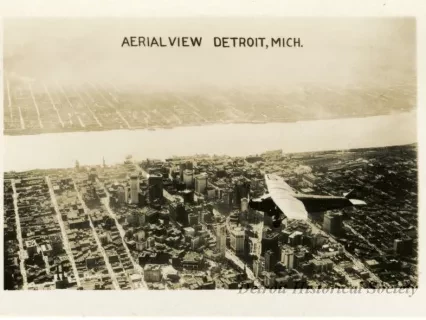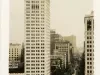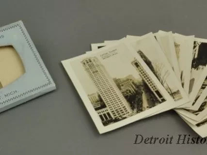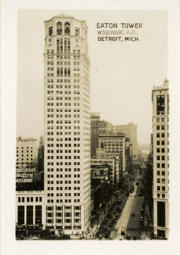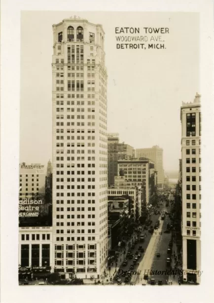 Small photographic print captioned, "Eaton Tower, Woodward Ave., Detroit, Mich." The north face of the Eaton Tower is shown, as viewed from an elevated position across Grand Circus Park. To its right, Woodward Avenue extends into the distance; cars, buses, and electric streetcars travel along it. The Madison Theater, and the David Whitney Building, Newcomb-Endicott, the Wurlitzer Building, the dome of the Wayne County Building, and the First National Building are visible as well.