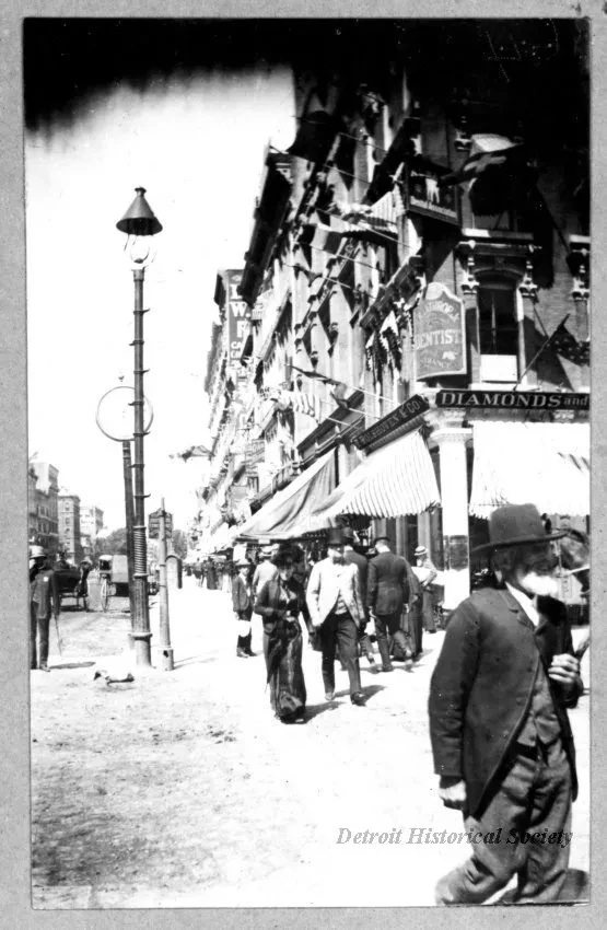 Print. Black and white copy of a photographic print depicting a street level view northward from the south east corner of Woodward Avenue and Gratiot Avenue. Among the pedestrians are a man with a beard, hat, and coat crossing Gratiot in the foreground, as well as a women in a dark dress and had holding a furled parasol and a man with a top hat and light-colored coat walking aside her on the sidewalk. A police officer is on the left edge of the frame. A streetlight with a conical top and hook-shaped rungs along its post is installed on the corner. Signs are posted for F. Rolshoven and Company and K. Lathrop Jr., Dentist. The image is printed with a grey border.