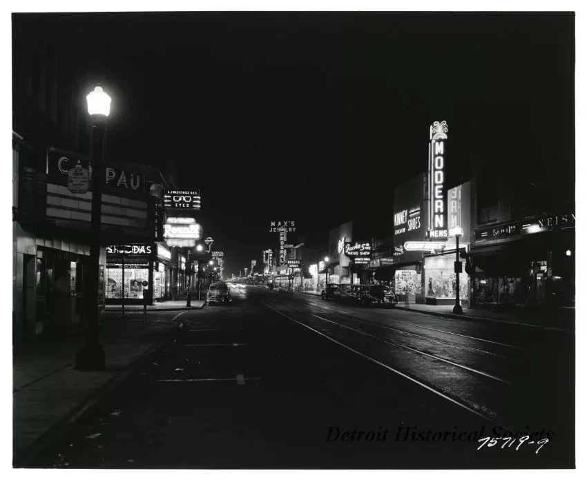Photograph. Black and white photo showing the intersection of Joseph Campau Street and Edwin Street in Hamtramck. The nighttime view looks northward along the west side of Joseph Campau Street just south of Edwin and shows storefronts, sidewalks, streetlights, and parked cars along both sides of the street. Streetcar tracks can be seen along the center of Joseph Campau Street. Business names that are visible include: Modern Men's Shop, Kinney Shoes, Jack's 5th Ave. Men's Shop, Baker's Shoes, Max's Jewelry, Federal Furniture Company, Dave Stober [men's clothes], Max's Jewelry, Federal Department Stores, Respondek Rexall Drugs, A. J Mackewicz, D.O.S., and the Campau Theater. The number, "75679-9," is printed in the lower right corner of the photo.